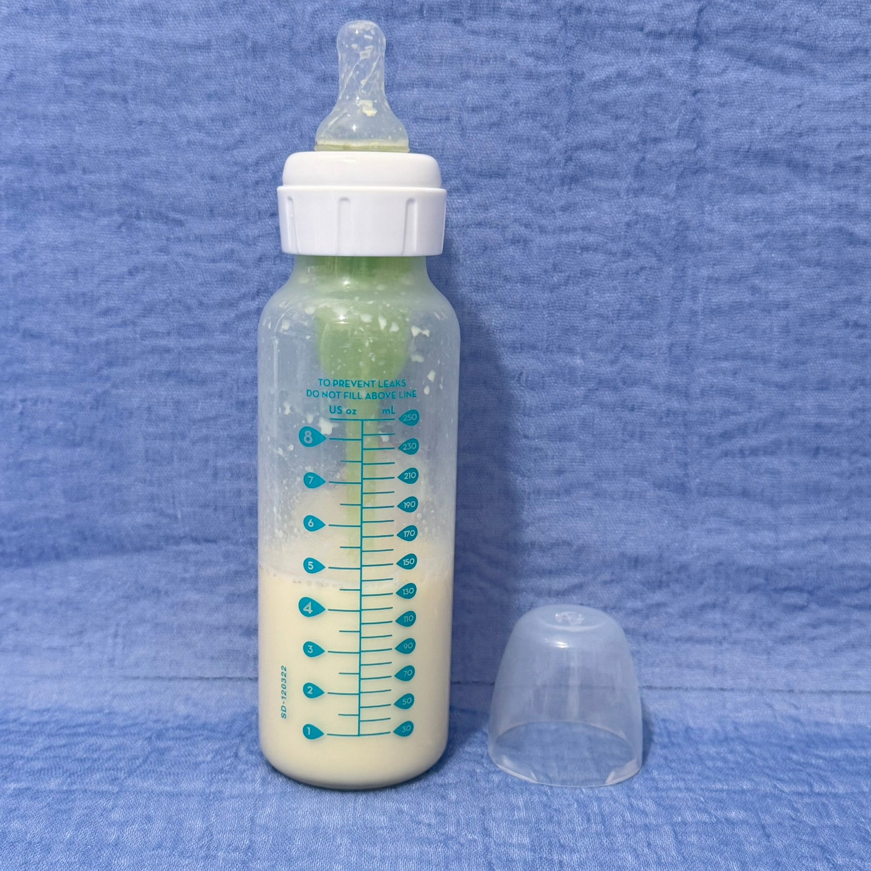 8oz Dr Browns bottle filled with approx. 4oz of fake milk formula