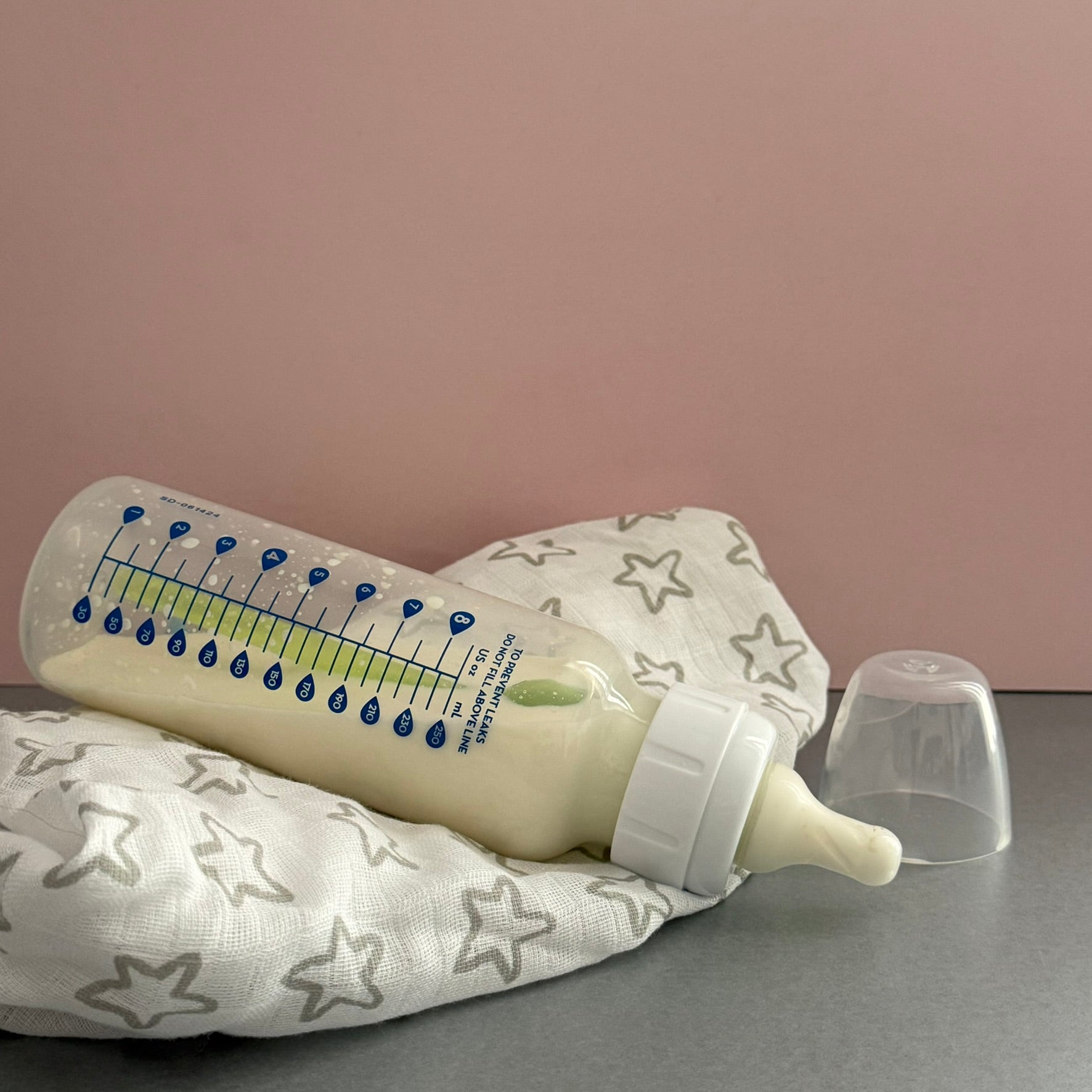 8oz Dr Browns bottle filled with approx. 5oz of fake milk formula