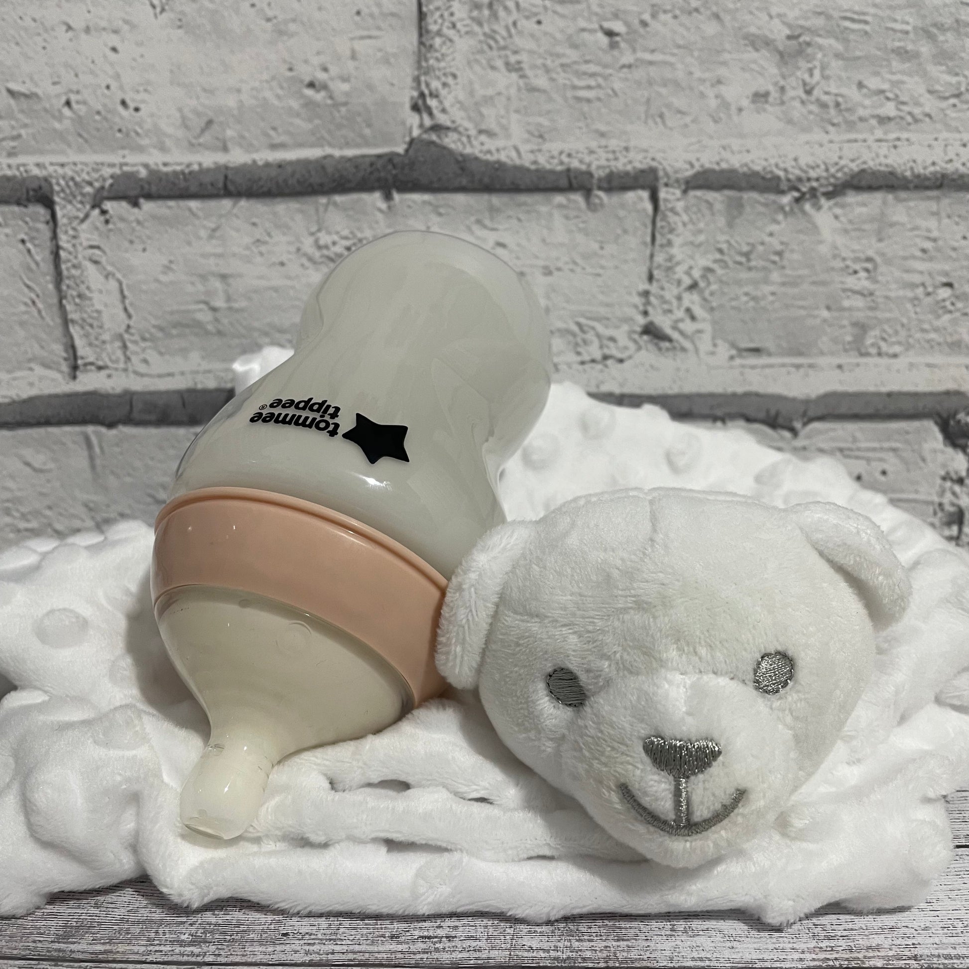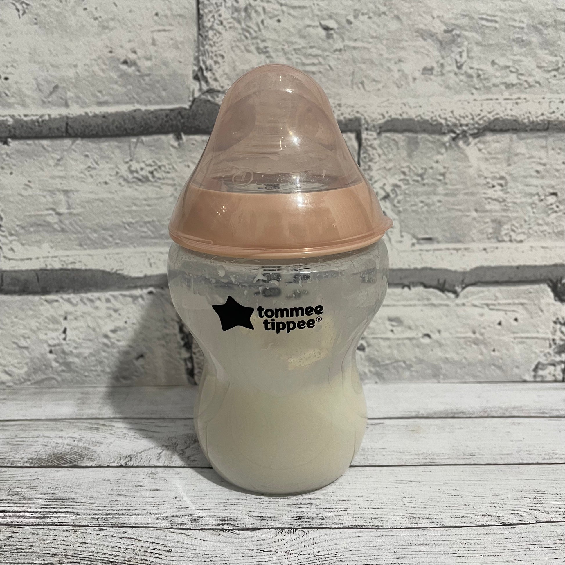 9oz Tommee Tippee bottle filled with approx. 4oz of fake milk formula