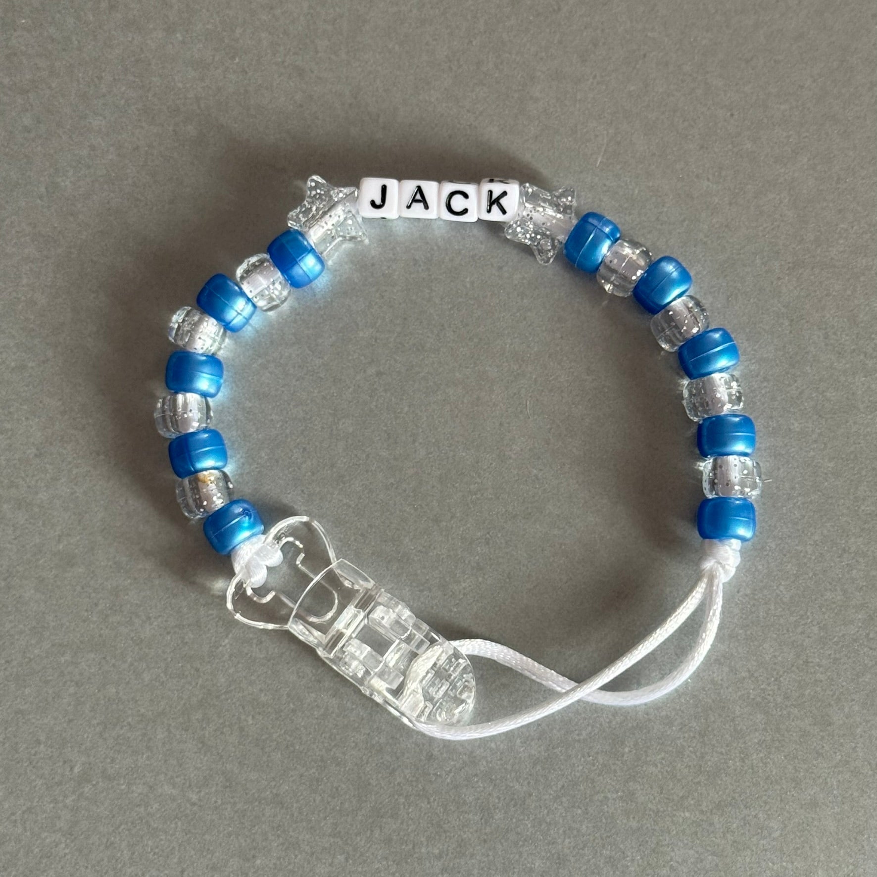 Beautiful Pearl Dark Blue & Glitter Personalised Dummy Clip, Handmade by me at Granny P's Nursery