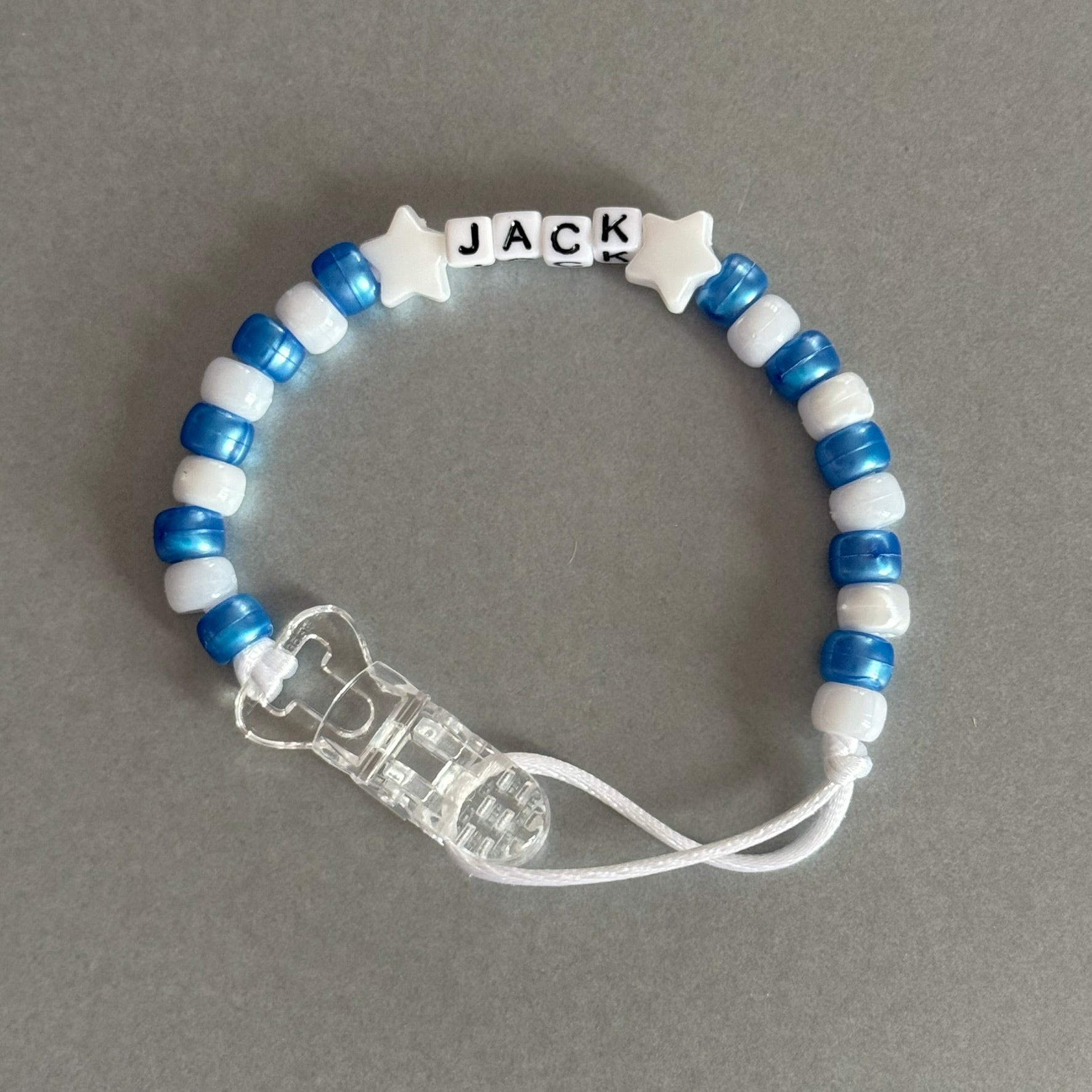 Personalised Reborn Dummy Clip: White Stars Pearl Dark Blue & White Beads