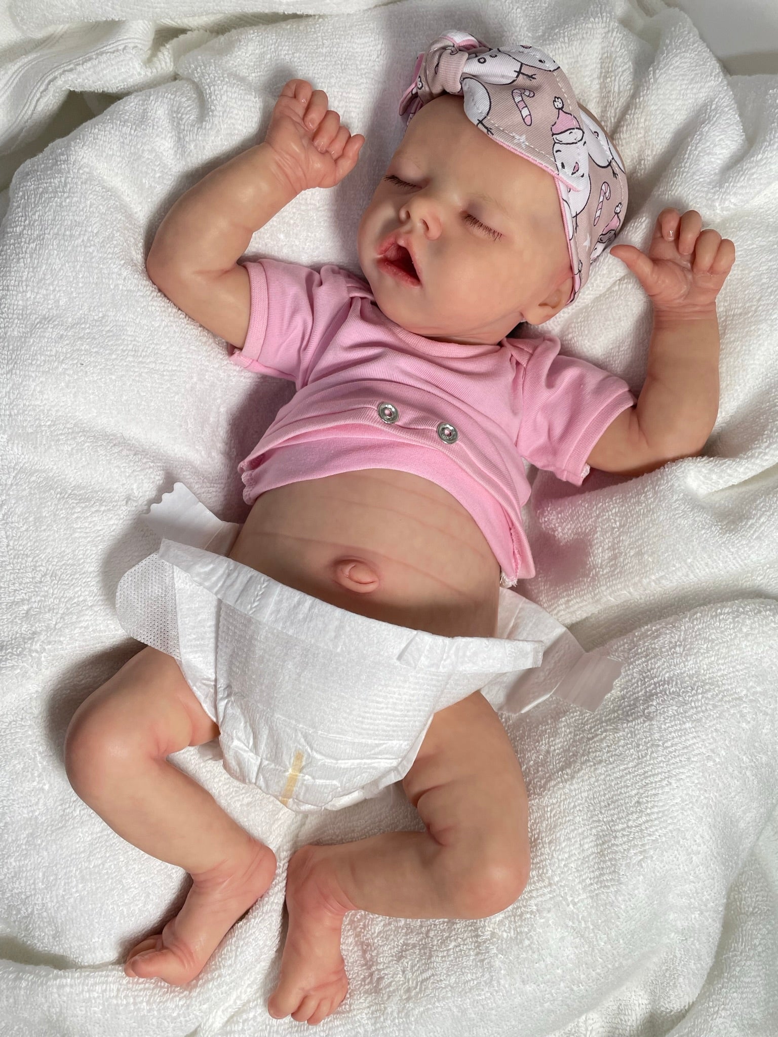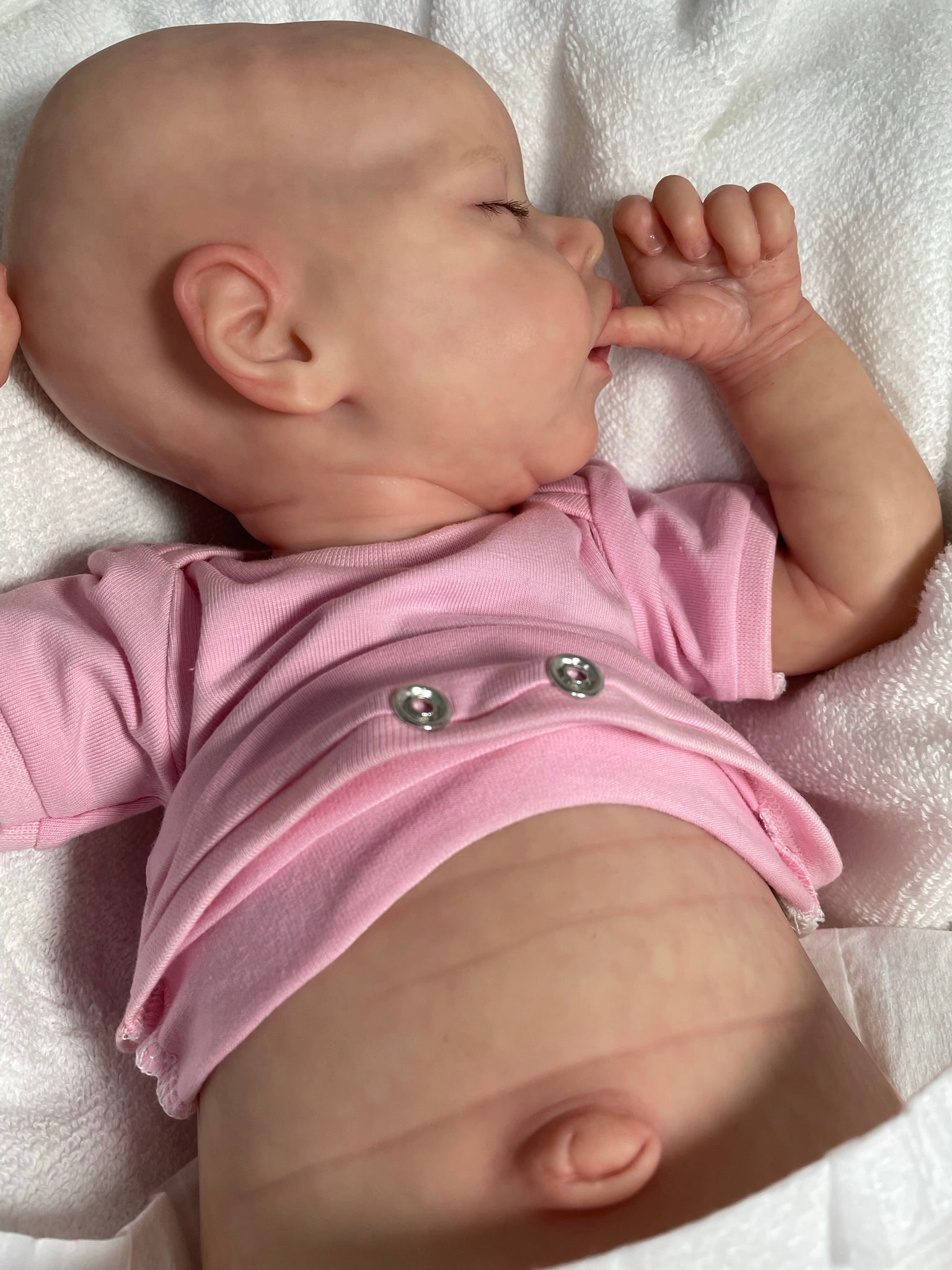 She has 3/4 arms, full legs, tummy plate and doe suede body, and weighs 3lb 14oz she is weighted with glass beads and tendertouch baby fat which is evenly distributed to feel as real as possible.